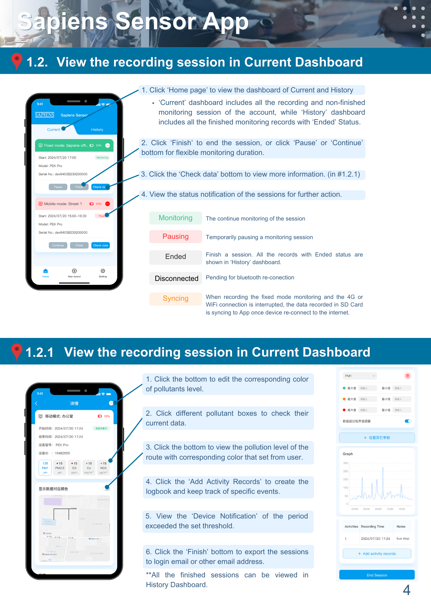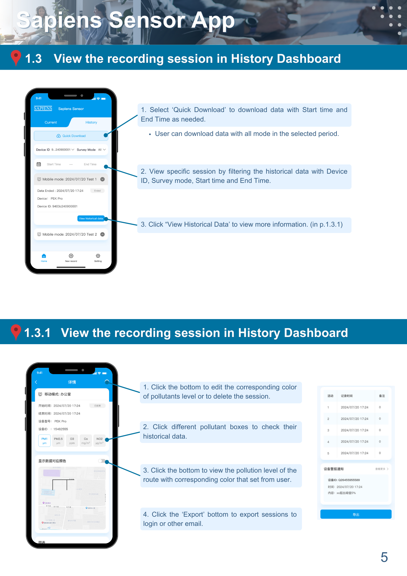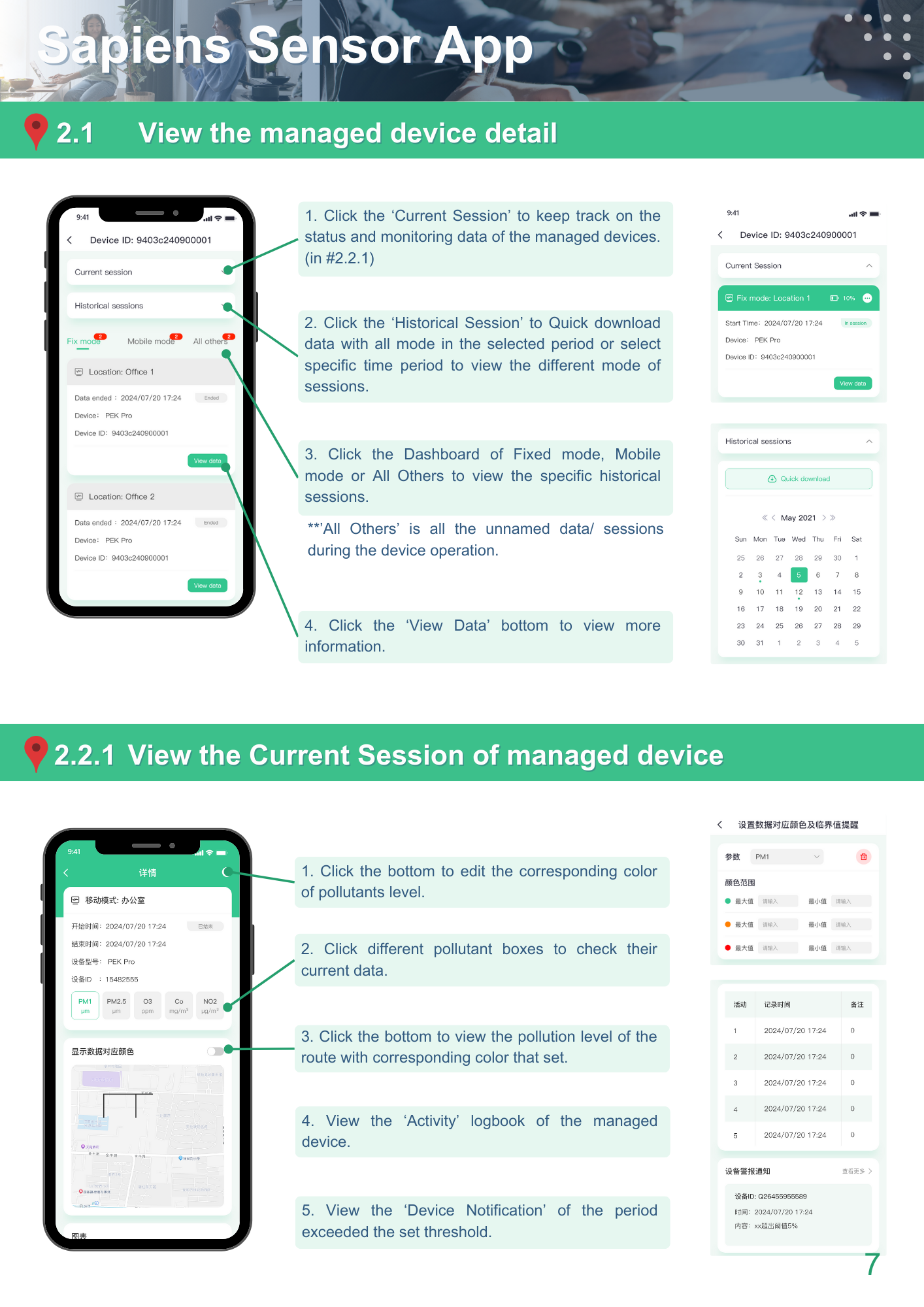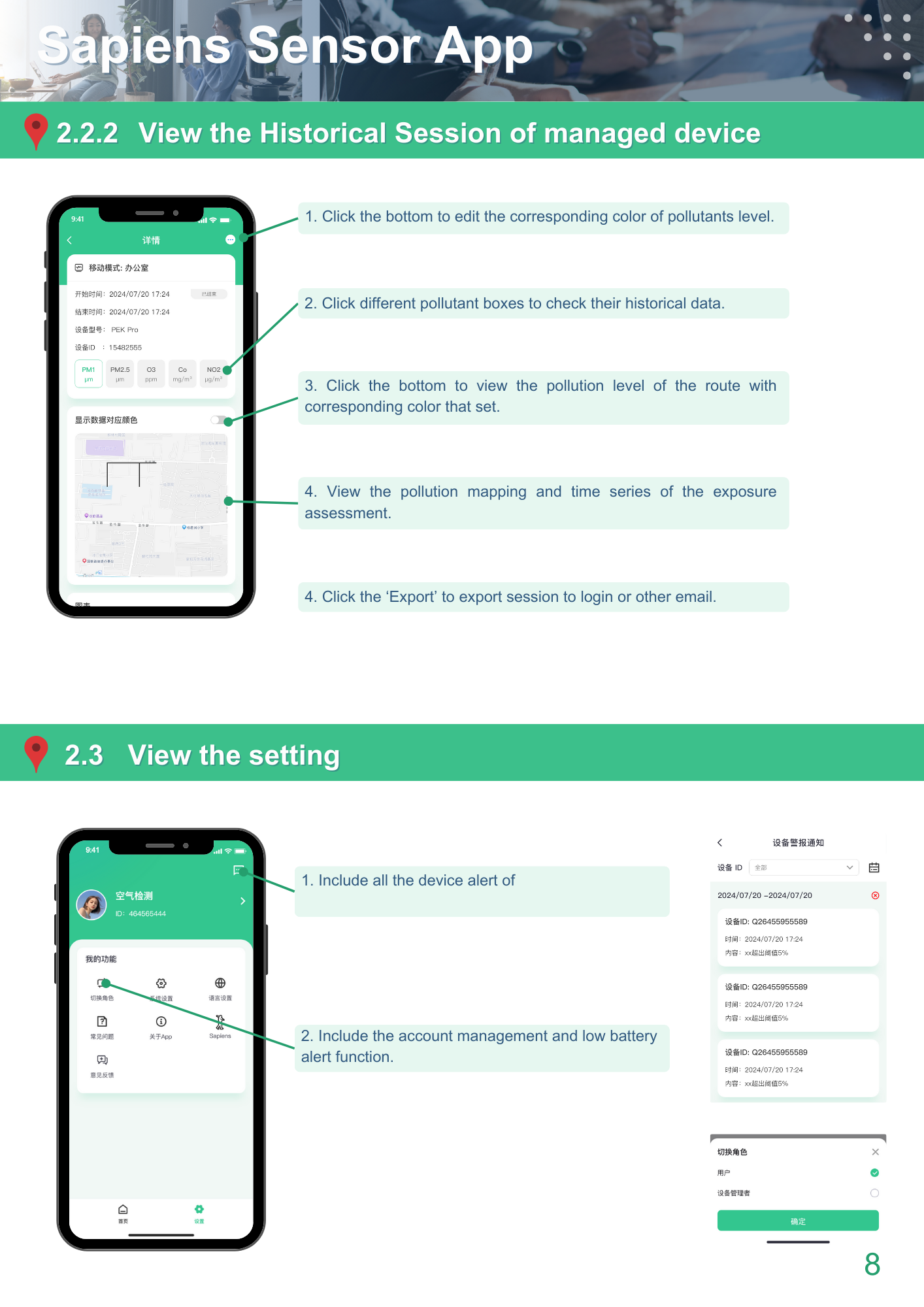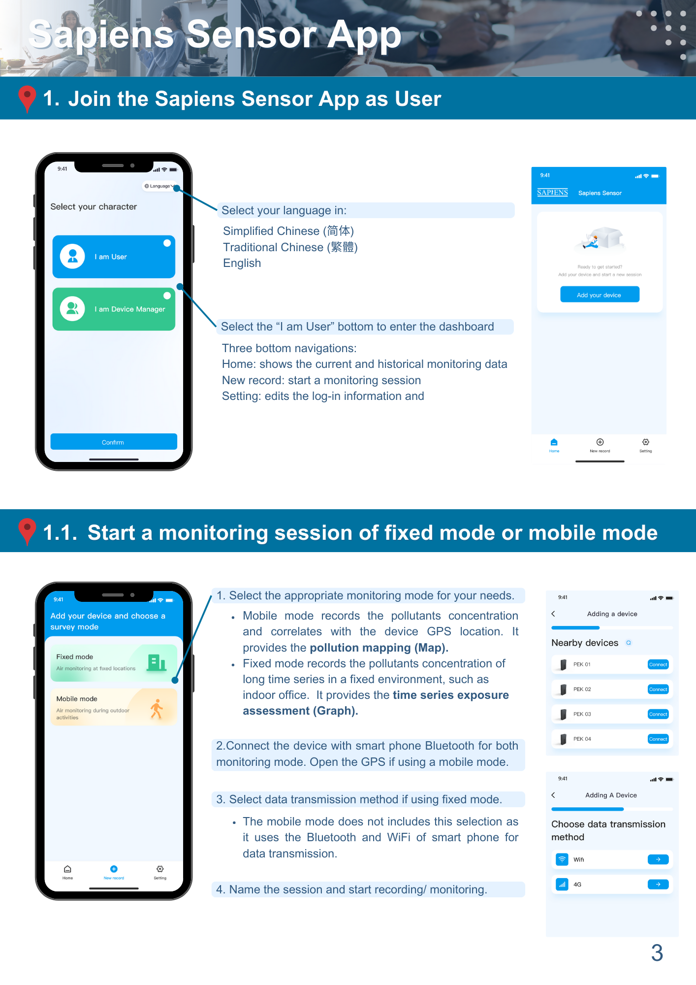 To be compatible with different users’ needs, two modes ‘User’ and ‘Device Manager’ are included. The ‘User’ mode focuses on personal exposure monitoring, while the ‘Device Manager’ mode allows multiple device management for advanced research.